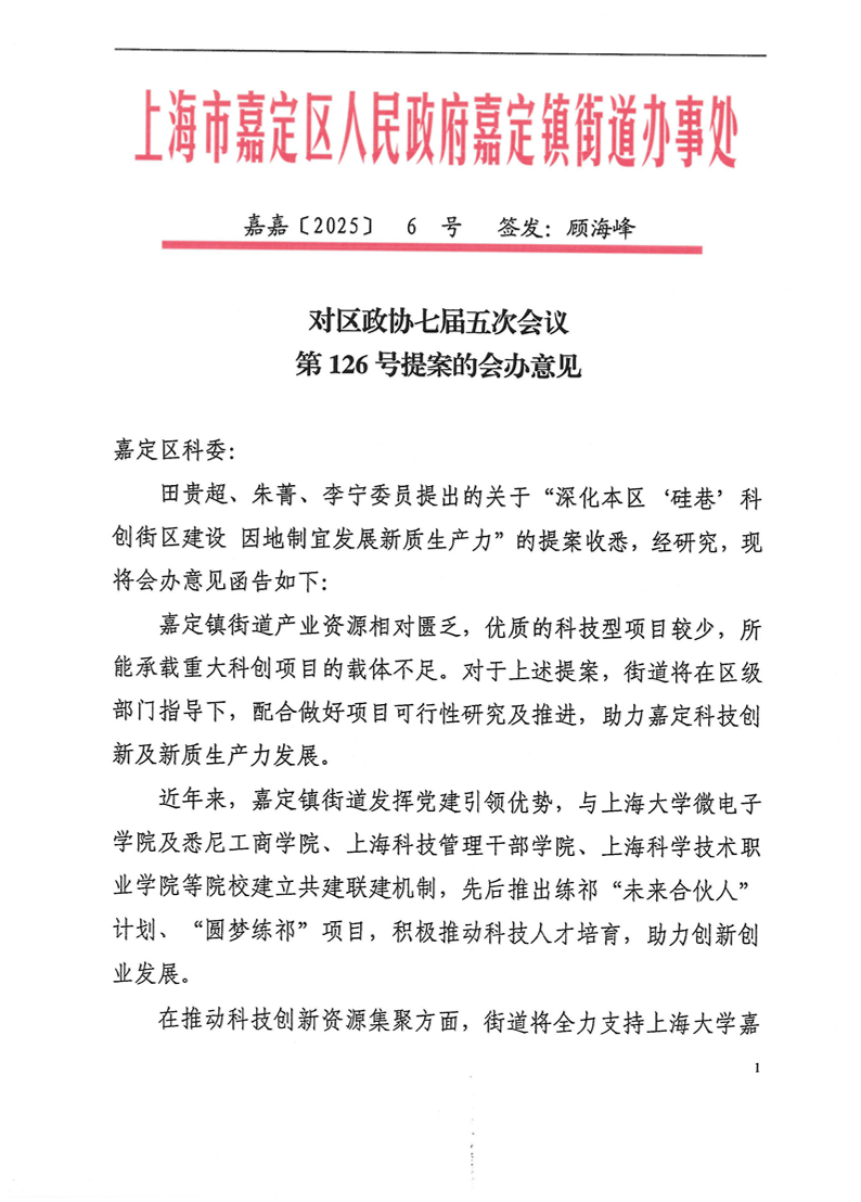 嘉定镇街道产业资源相对匮乏,优质的科技型项目较少,所能承载重大科创项目的载体不足。对于上述提案,街道将在区级部门指导下,配合做好项目可行性研究及推进,助力嘉定科技创新及新质生产力发展。